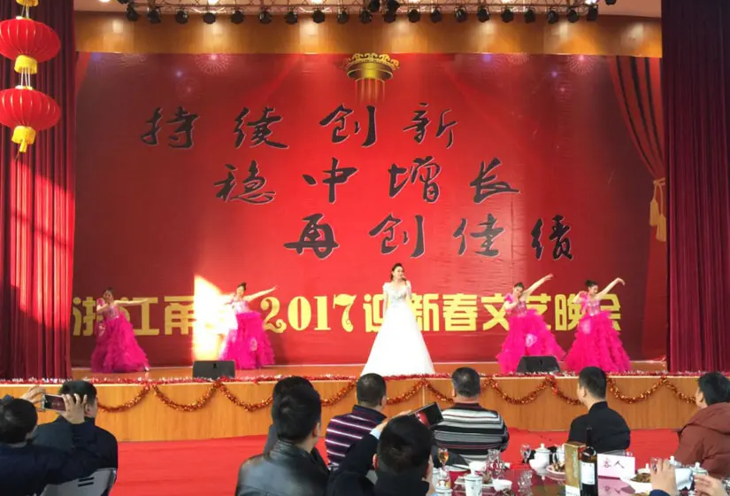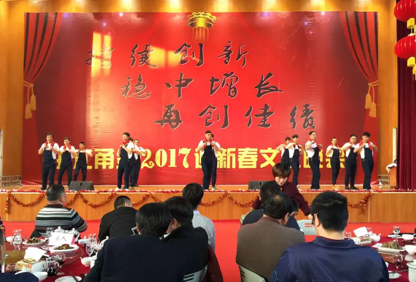晚宴上,甬金人和客户们欢聚一堂,载歌载舞,喜迎凤凰年的到来。周德勇总经理发表了激情洋溢的新年致辞并宣布晚宴开始,董事长虞纪群、总经理周德勇与公司各高层领导向每位员工敬酒,在每一桌的杯光酒影中,我们看到了员工们充满坚定而憧憬的眼神,相信在充满希望的2017年里,董事长虞纪群会带领甬金人向更高的目标迈进。